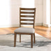 Simply designed with transitional flair, a clean and crisp silhouette brings focus to the ladder back chairs and the slightly curved hind legs, along with its contrasting light gray upholstered cushions.
