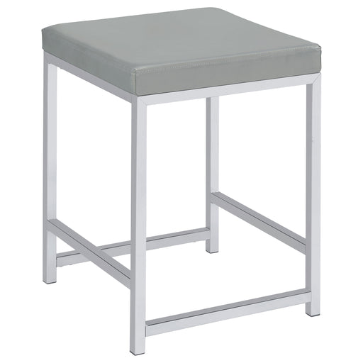 Rest comfortably in this chic contemporary vanity stool as you apply makeup or prepare for the day. Featuring a square shape design and a densely padded, foam-filled cushion , this modern stool provides a spacious for long-lasting comfort. The seat cushion is also wrapped entirely in a smooth grey tone leatherette. With a backless design, you can slide it beneath a vanity table when not in use. The base offers all the support you need with a heavy gauge steel frame with a gleaming electroplated, polished chrome finish. Key Features: • This backless stool is a testament to contemporary design • Full foam padded seat cushion upholstered in a durable leatherette • Heavy gauge steel frame electroplated and polished in chrome • Constructed with steel, MDF, foam, and leatherette • Available in dark grey and light grey to match with any palette